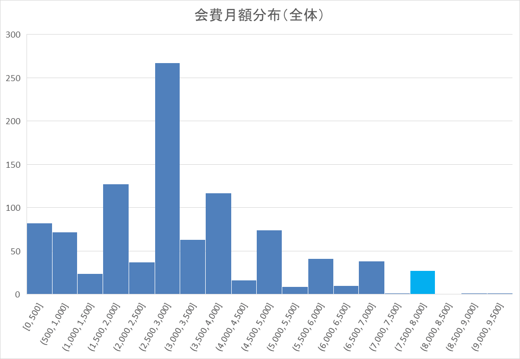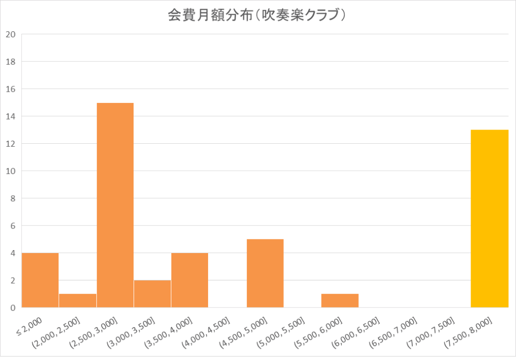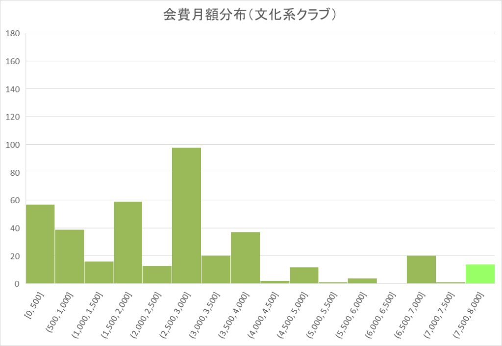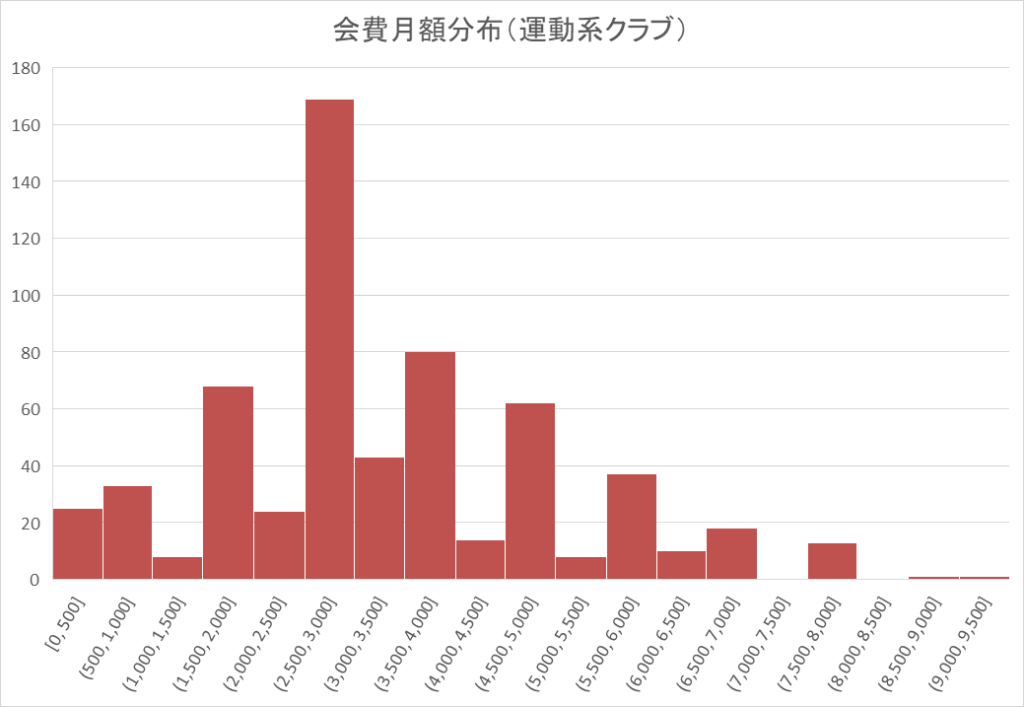 運動系クラブについても月会費の分布をグラフにしてみました。
