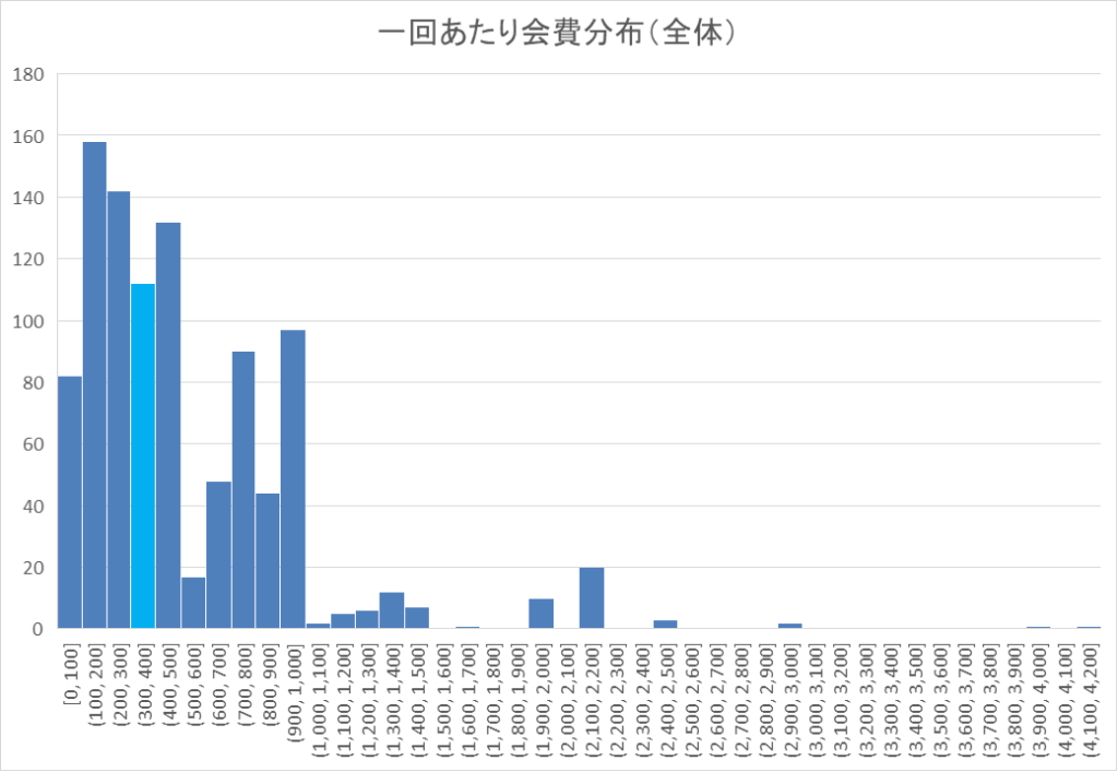 コベカツでは月1回の活動のクラブから週5回(月20回)活動するクラブもありますので、月会費だけで単純比較はできません。そこで1回あたりの会費の分布もグラフにしてみました。