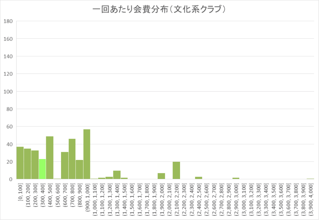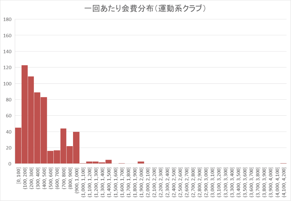 1回あたりの会費も全体とほぼ同様の傾向。運動系クラブの方が多いので、まあそうだろうという感じです。